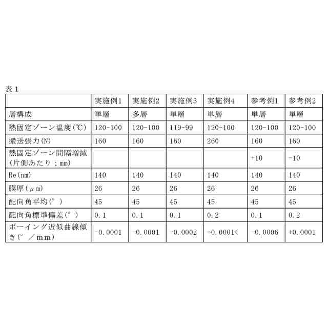一般に、光学フィルムでは、厚さ、レターデーション、遅相軸方向といった種々の特性が、面内で均一であることが求められる。延伸した長尺のフィルムは、理論的にはフィルムの全面にわたって、長手方向又は幅方向に遅相軸を有することが期待されるが、実際には、遅相軸の方向が面内の位置によって不均一であることがある。
