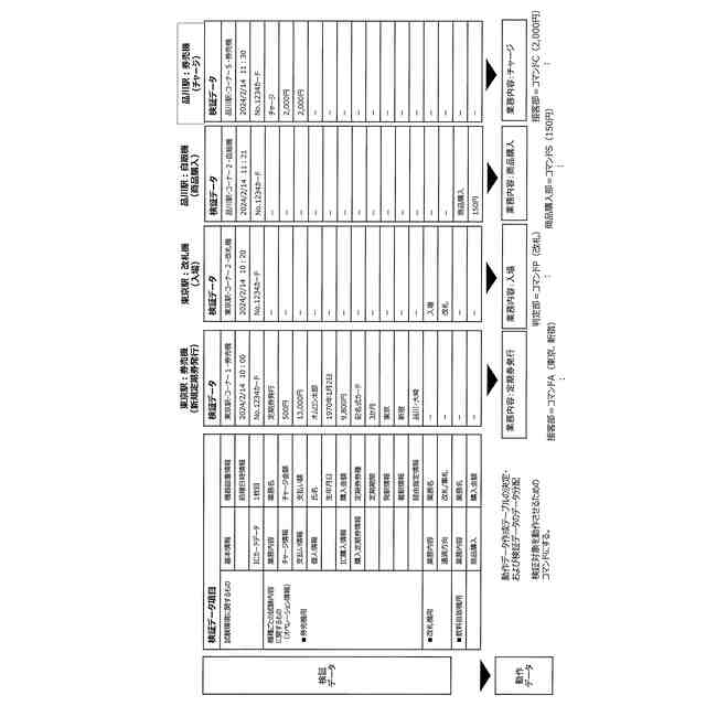 検証データに含まれる業務指示は、例えば、券売機の定期券発行、自動改札機の通過処理、ICカード処理機の入金処理、物販機器の物販処理等を含む。