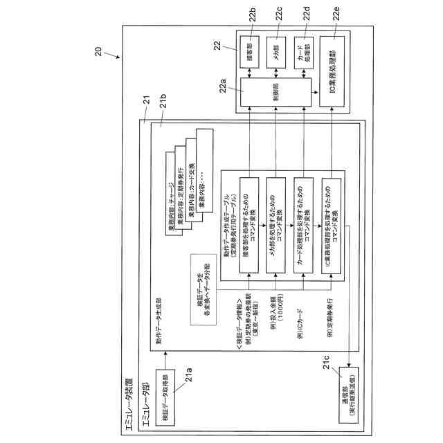これにより、各機器の業務指示ごとに生成された複数の動作データを用いて、各機器のテスト検証をソフト的に実施することで、実際に、ICカードを用いて駅務機器や物販用機器を動作させることなく、各機器の異常や動作エラーの有無等を検証することができる。