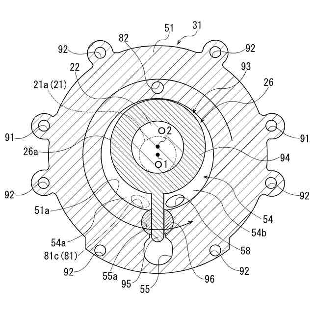 駆動軸線と直交する断面において、シリンダは真円形状の内部空間を有しており、また、ローラは真円形状の外周面を有している。ローラは、駆動軸に固定され、シリンダの内部空間内で駆動軸と共に回転する。シリンダの内部空間の軸心は駆動軸線から偏心しており、ローラの外周面の一部がシリンダの内周面に接触している。これにより、ローラの外周面とシリンダの内周面との間に作動室が形成されている。
