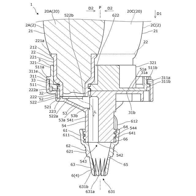 以下、本開示の実施形態を図面に基づき説明する。図1は、絞出具1の全体図である。使用者(例えば、子ども等の遊戯者)は、絞出具1の各容器2(2A~2C)に充填されたクリーム状物20(20A~20C)を容器2の後方(図1の上方)から前方(図1の下方)に移動するように絞ることにより、クリーム状物20を先端の口金6の開口部631から絞り出す(押し出す)ことができる。絞り出されたクリーム状物20は、図示しない台座(装飾対象物)等の被形成面に盛り付けられて生クリームによる装飾が施された洋菓子等を模した装飾体玩具の作成に使用することができる。