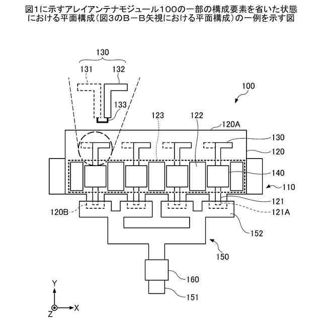 図1に示すアレイアンテナモジュール100の一部の構成要素を省いた状態における平面構成(図3のB-B矢視における平面構成)の一例を示す図である。