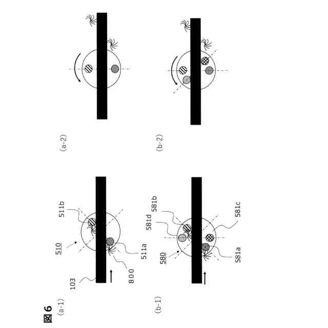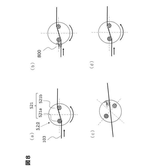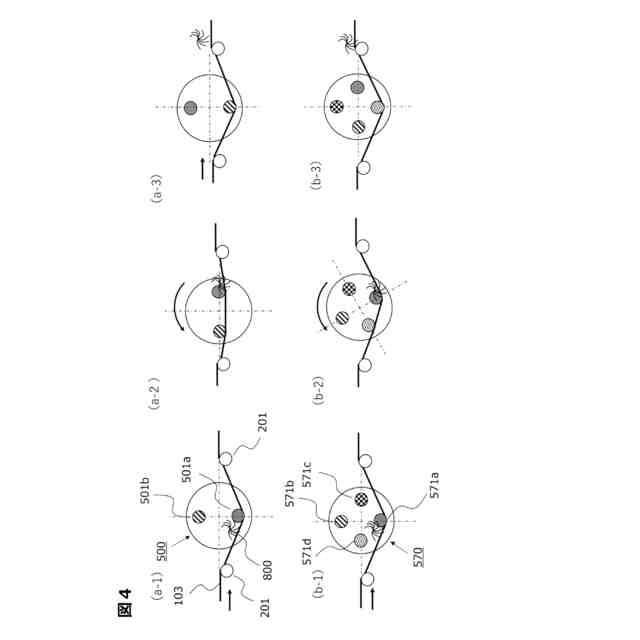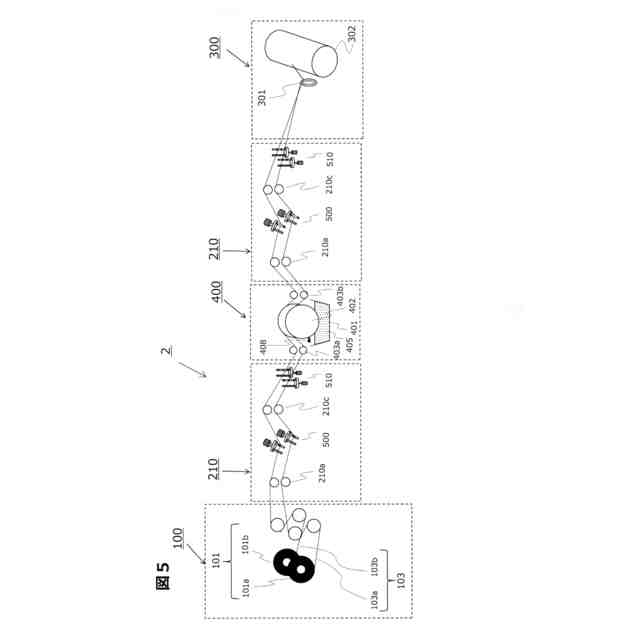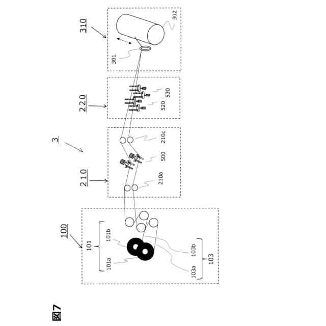 ここで、繊維束103の走行路にはガイドを用いて位置を規制するのが一般的である。生産性を向上するため、複数本の繊維束103が用いられ、強化繊維の糸幅を維持しつつ、かつ蛇行による繊維束103の走行位置や巻取位置がばらつくことを抑制するため、繊維束103の搬送路を規制するため種々のガイドが用いられる。例えば、繊維束ガイド手段200′、200″には、自由回転可能なガイドローラ201aや固定型であるガイドバー201b、さらに等ピッチの櫛歯状をなす複数のピンが立設された櫛部材201cが設けられている。これらのガイドやピンの間を繊維束103が通過することで、繊維を均一に配置し、搬送位置を規定することができる。繊維束巻取手段300′には、巻付ヘッド301のトラバース移動による繊維束103の走行路のズレを抑制するため櫛部材303などが用いられている。