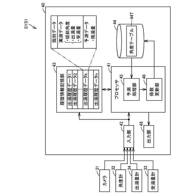 前記実測データに含まれる出湯量および受湯量に基づいて算出される出湯タイミングごとの変動湯量実測値と、前記予測データに含まれる予測値の変化量である変動湯量予測値との変動湯量誤差を算出する誤差算出手段と、