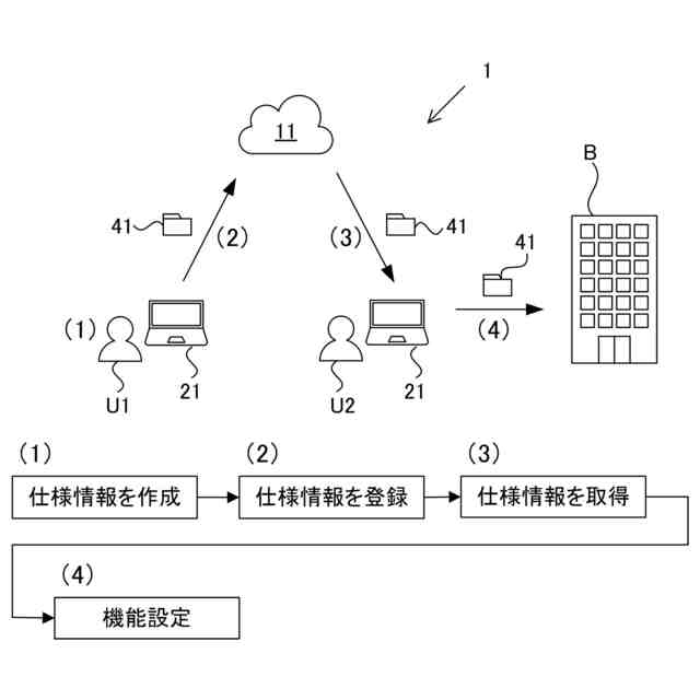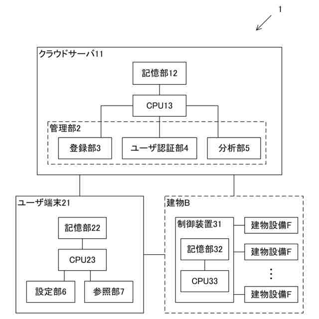 図1に示すように、この実施形態の仕様情報管理システム1は、建物設備Fの機能設定に関する情報を含む仕様情報41(図4参照)と、仕様情報41を管理する管理部2と、仕様情報41を用いて建物設備の機能設定を行う設定部6と、建物設備Fに設定された仕様情報41を参照する参照部7とを備える。管理部2はクラウドサーバ11に設けられている。設定部6及び参照部7はユーザ端末21に設けられている。複数の建物設備Fと、複数の建物設備Fを制御する制御装置31とは、建物Bに設けられている。