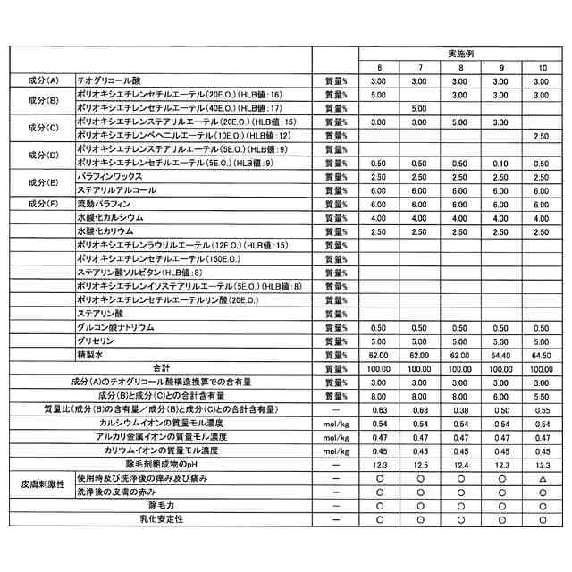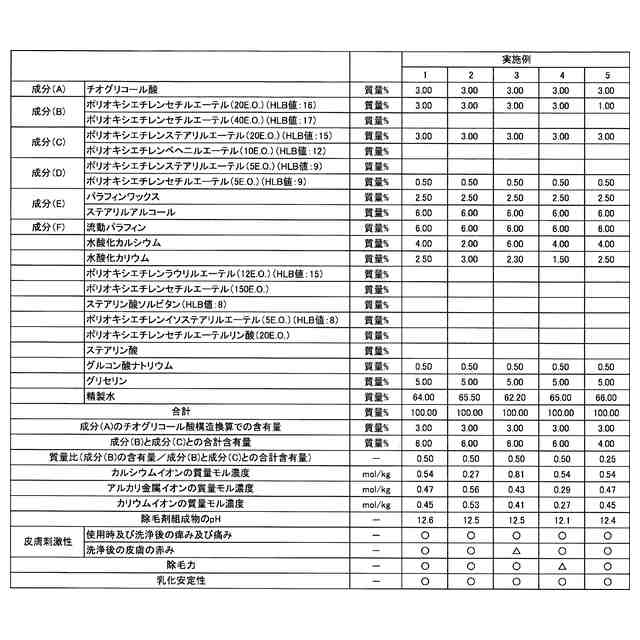 下記の特許文献2には、チオグリコール酸と、水酸化ナトリウムと、水酸化カルシウムと、HLBが13以上のポリオキシエチレンアルキルエーテルと、セチルアルコール、ステアリルアルコール、流動パラフィン及び固形パラフィンからなる群より選択された油性物質と、水とを含むクリーム状除毛剤組成物が開示されている。このクリーム状除毛剤組成物では、上述した各成分が特定の含有量で含まれる。