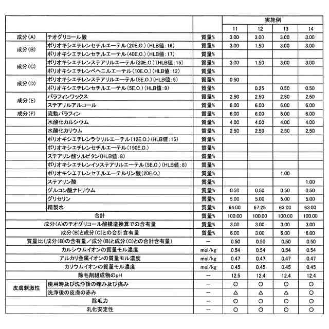 皮膚刺激を抑制するために、チオグリコール酸及び/又はその塩の含有量を単に少なくしたり、アルカリ剤の含有量を単に少なくしたりした場合には、除毛力が低下する。