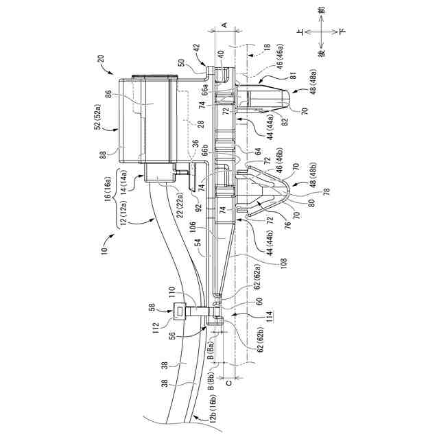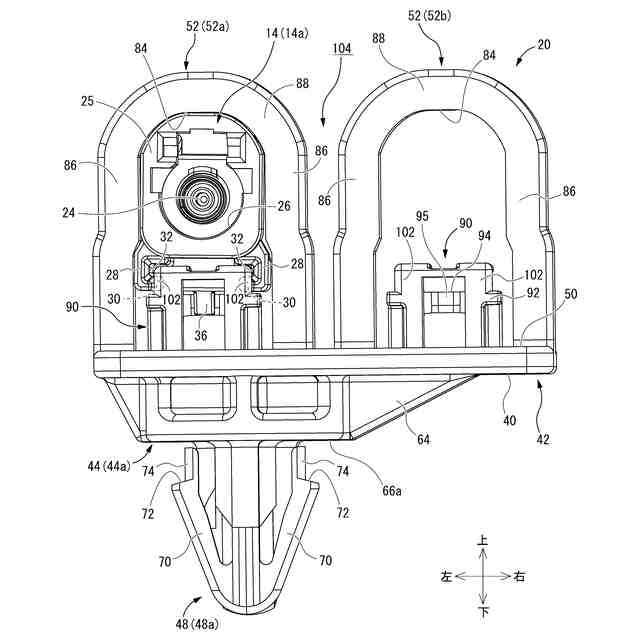 前記クリップの前記一対の弾性係止片は、前記柱状部を間に挟んで相互に対向する対向方向で弾性変形可能であり、前記各弾性係止片は、前記各弾性片の突出先端側に設けられた係合部を有し、前記嵌合穴に挿し入れられた前記クリップの前記弾性係止片が弾性復帰した際に、前記係合部が前記嵌合穴に係合することで前記クリップの前記嵌合穴からの抜け出しが阻止されるようになっており、