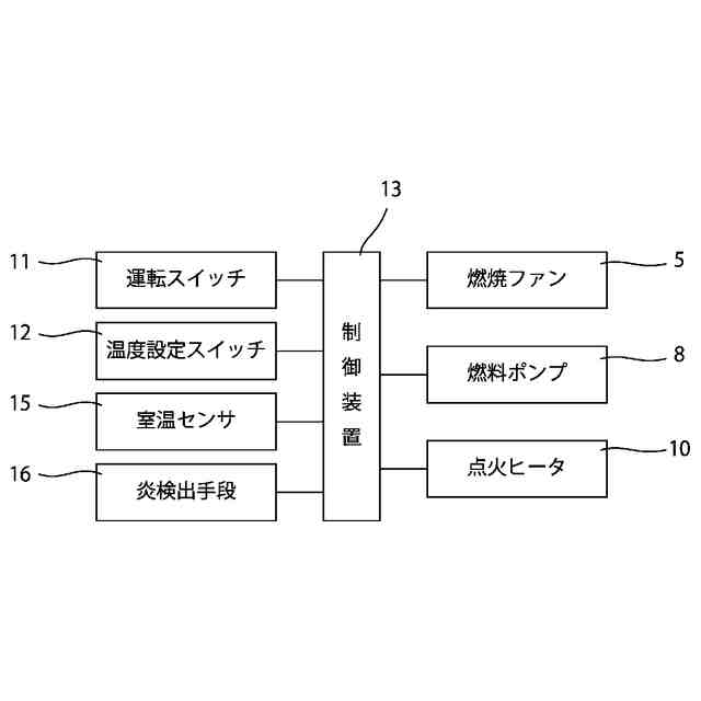 【解決手段】 側壁に多数の空気孔4aを備えるポット4と、ポット4が配置される風胴3と、風胴3に接続されてポット4に燃焼空気を供給する燃焼ファン5と、燃料貯留部7の燃料をポット4に供給する燃料ポンプ8とを備える。ポット4と燃料ポンプ8を接続する燃料パイプ9には高所Aを備え、高所Aから燃料ノズル9aまでを下り勾配とし、燃焼ファン5と燃料貯留部7に同圧ホース17を接続し、燃料貯留部7と燃料パイプ9の高所Aに空気パイプ18を接続する。制御装置13は、消火信号を受けて燃料ポンプ8を停止して燃焼ファン5を所定回転数に設定し、炎検出手段16からの炎不検出の信号で燃焼ファン5を第2の所定回転数に設定し、設定時間経過後に燃焼ファン5を停止することで、燃料パイプ9内の燃料を押し出して燃料が残らないようにする。