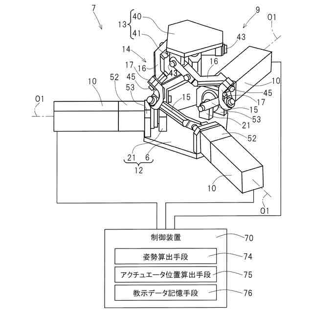 前記先端側リンクハブ13の教示をダイレクトティーチングにより行うとき、前記パラレルメカニズム9に予圧を掛けていない状態で、前記アクチュエータ10の位置から順変換により前記先端側リンクハブ13の姿勢を算出する姿勢算出手段74と、