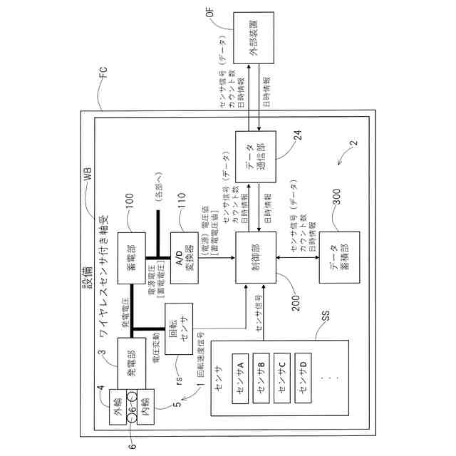 センサ付き軸受は、軸受の回転により発電部(発電機)で発電した電力を蓄電部に蓄えて電子回路を動作させるため、軸受が回転しないと蓄電部の蓄電電圧が低下して回路の動作が停止する。よって、センサ信号を取得した日時等の時間情報(センサ信号の日時情報)を保持することができない。