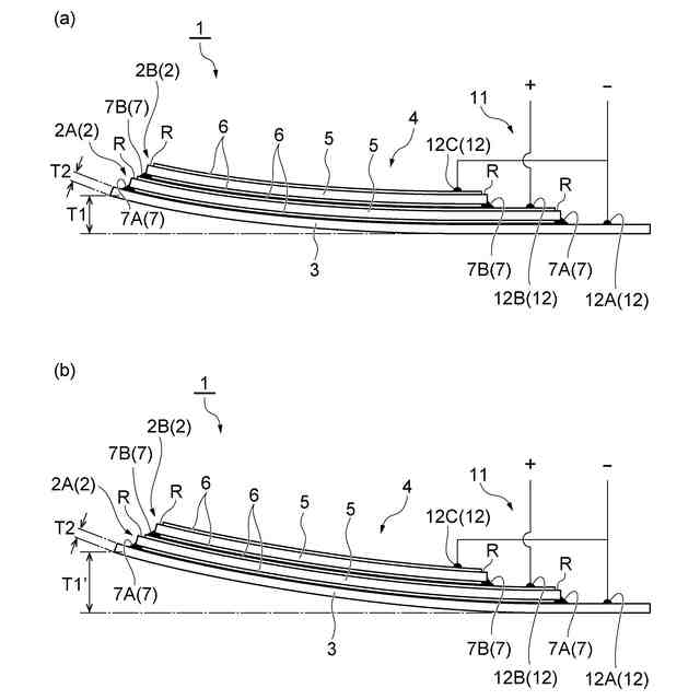 [2]前記圧電素子への駆動電圧が非印加の状態において、前記圧電部の反り量は、前記振動板の厚さよりも大きくなっている、[1]記載の圧電アクチュエータ。圧電素子への駆動電圧が非印加の状態において、圧電部に十分な反り量を付加しておくことで、低電圧でより大きな変位量を確保できる。