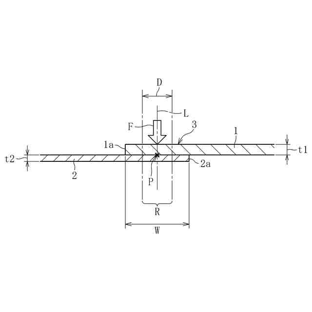 片側スポット溶接は、重合部103を下方から支持しない状態で上方のみから溶接電極130で押圧するため、重合部103が変形しやすく、接合予定部Pに加わる加圧力はワークの剛性に依存する。しかし、現状では、片側スポット溶接で接合するために、ワークにどの程度の剛性が必要であるかについての判断規準は確立されておらず、良好な溶接部が得られるようなワークの構造を定義することが難しかった。そのため、下板102の板厚を過剰に増やしたり、ビードを過剰に設けたりすることになり、コストや重量が増加して、片側スポット溶接の利点が減少してしまう。