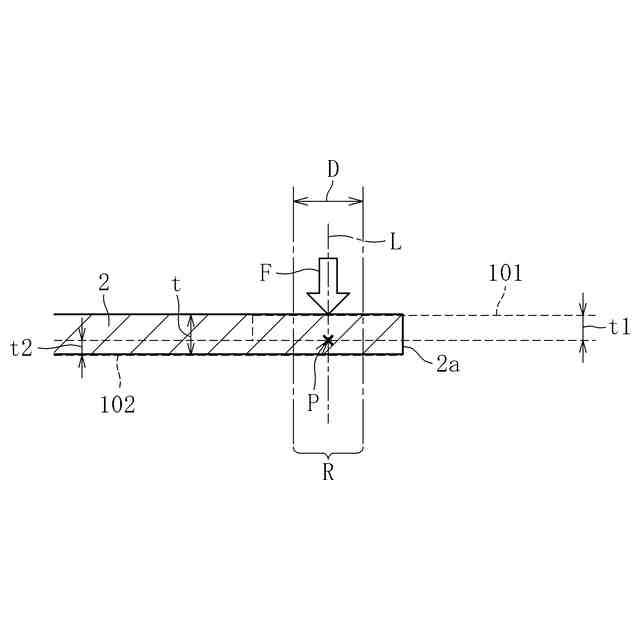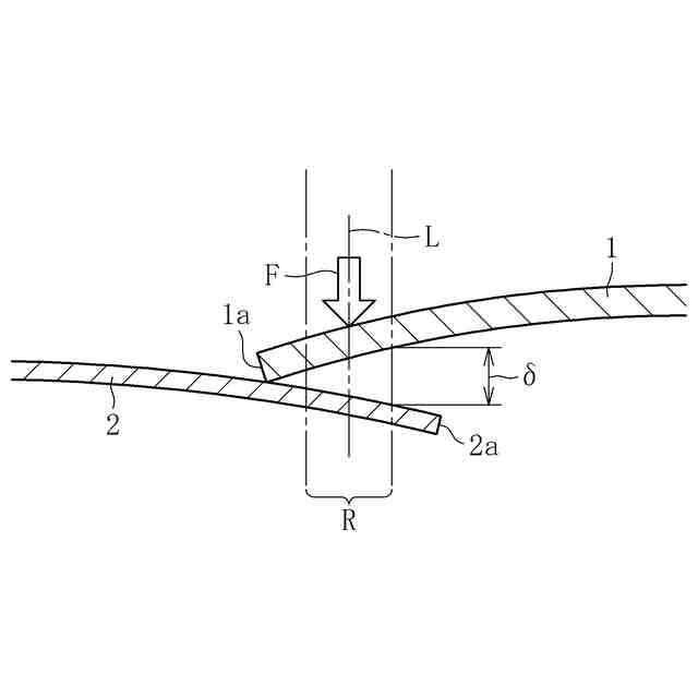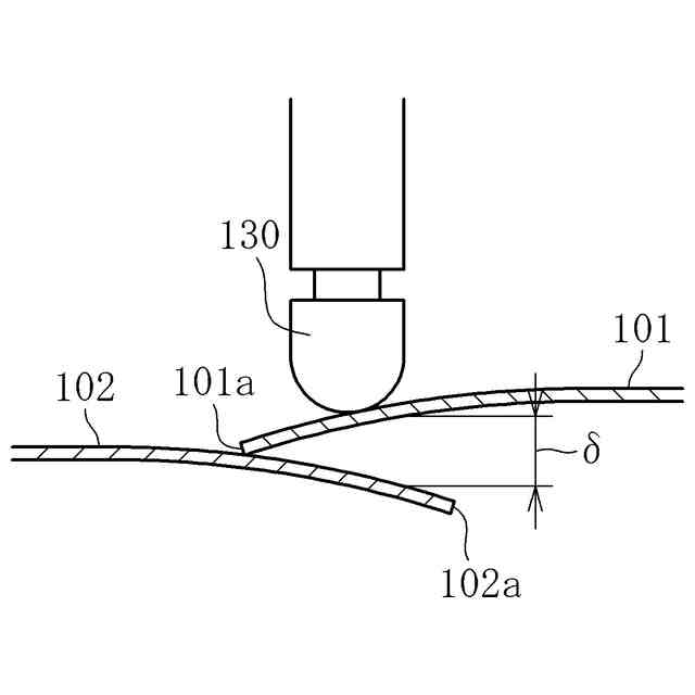 図5に示すように、上板101の端部101a付近と下板102の端部102a付近との重合部103に片側スポット溶接を施す場合、図6に誇張して示すように、溶接電極130により上板101が下方に押し下げられ、さらに上板101の端部101aで下板102が押し下げられる。従って、押圧前の状態では図5に示すように上板101と下板102との間に隙間が無い状態であっても、溶接電極130で押圧することで図6に示すように上板101と下板102とが離反する。上板101と下板102の重合部103の剛性が不十分であると、溶接電極130で押圧したときの上板101と下板102との間の隙間が過大となり、溶接不良が生じる。このように、片側スポット溶接では、溶接電極で押圧する前の状態での板間の隙間だけでなく、溶接電極で押圧した状態での板間の隙間が溶接品質に大きく影響する。本発明者は、この点に着目し、溶接電極で押圧したときに形成される上板101と下板102との間の隙間(以下、「泣き別れ隙量δ」と言う。)の大きさにより、ワークの構造を評価できるのではないかと考えた。