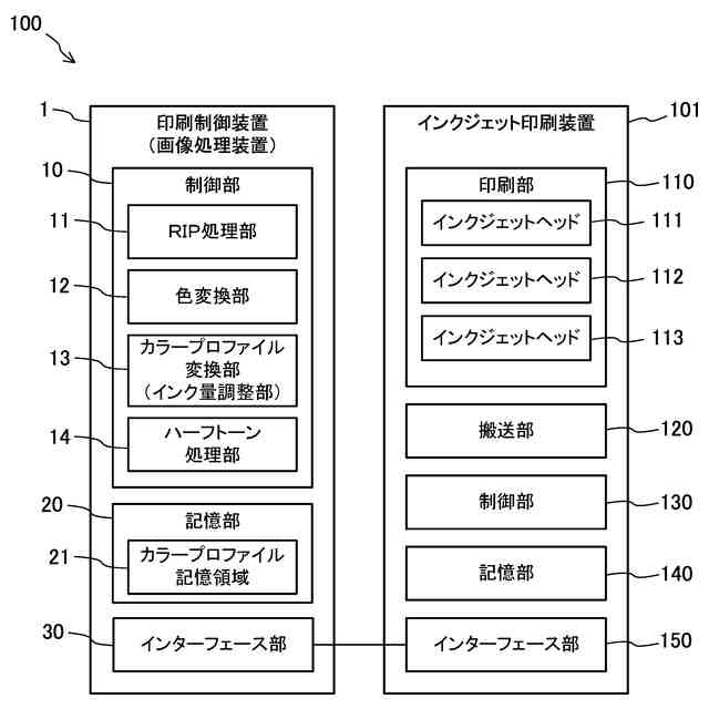【解決手段】画像処理装置(印刷制御装置1)は、複数のインク色(CMYKP)への色変換を行う色変換部12と、各画素に対応する複数のインク色の総インク量が規定量Xを超える場合に、複数のインク色の比率を維持したまま総インク量を減少させ、この減少させた総インク量を維持したまま複数のインク色の比率を調整するインク量調整部(カラープロファイル変換部13)とを備える。