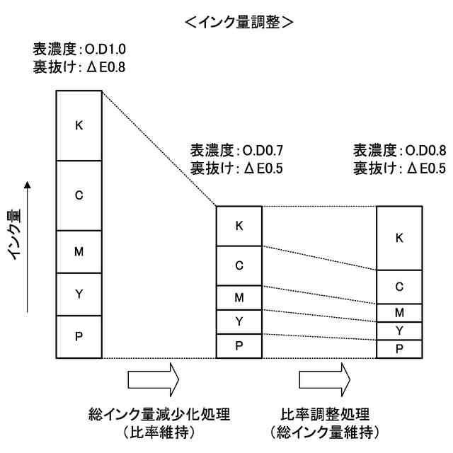 ところで、油性インクを用いたインクジェット印刷装置では、表濃度の発色性向上のために一定のインク量を打ち込む必要がある。一方で、油性インクはインク量が多ければ多いほど、印刷媒体に浸透した油性溶剤の影響で裏側から表濃度が視認できる状態、いわゆる「裏抜け」が顕著になる。ユーザの用途(例:両面印刷)によっては、裏抜けを低減させたいため、インク量を調整し一定値以下にすることが求められる。