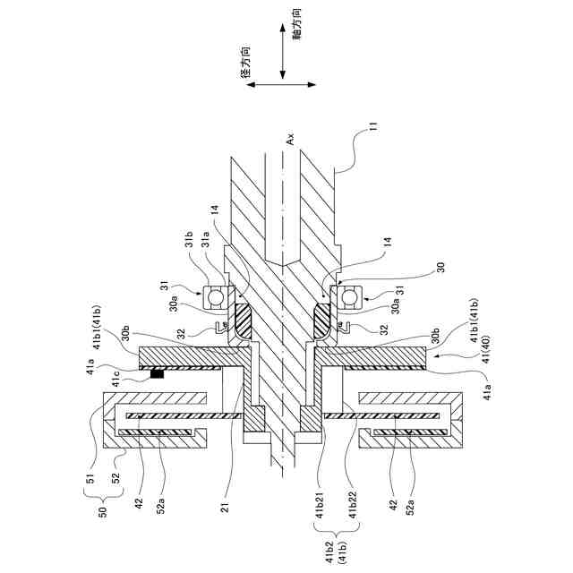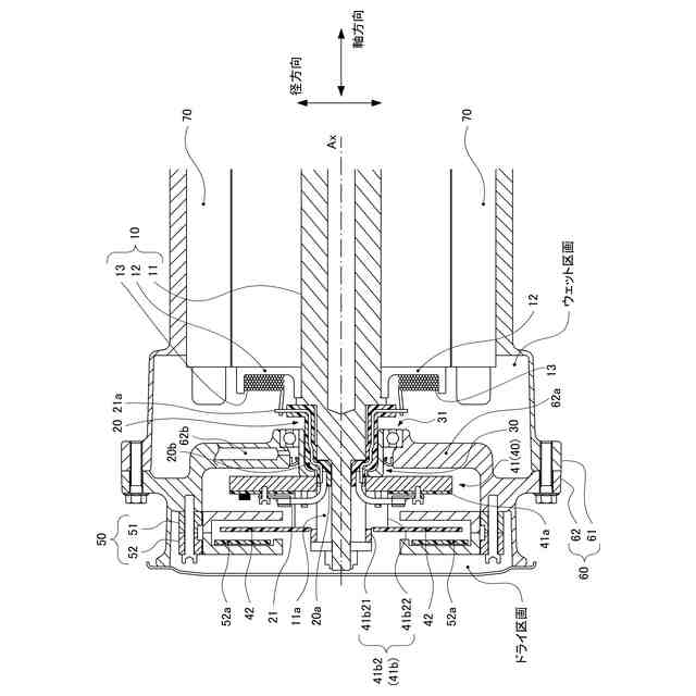 従来の技術においては、ドライ区画とウェット区画とを分けるために、複雑な構成のベアリングが用いられており、ベアリングの耐久性を高めることが困難であった。具体的には、従来の技術におけるベアリング30のインナーリング(インナーレース)32は、アウターリング(アウターレース)31と比較して軸方向に長く、シール60と接する位置まで達している。このため、インナーリング32の軸方向の長さがアウターリング31と同等である構成と比較して、回転に伴ってシャフト10や整流子20からインナーリング32に遠心力が作用した場合にインナーリング32が変形する余地が大きい。インナーリング32が変形すると、ボール33を介したベアリング30の動作が適正な動作ではなくなり、ベアリング30の耐久性が低下する可能性が高くなる。