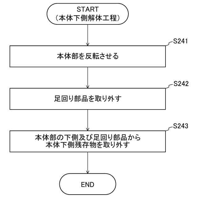 前記本体部を反転させた後、足回り部品を取り外し、その後、前記本体部の下側及び前記足回り部品から本体下側残存物を取り外す各作業を前記自動車解体機で行う本体下側解体工程と、