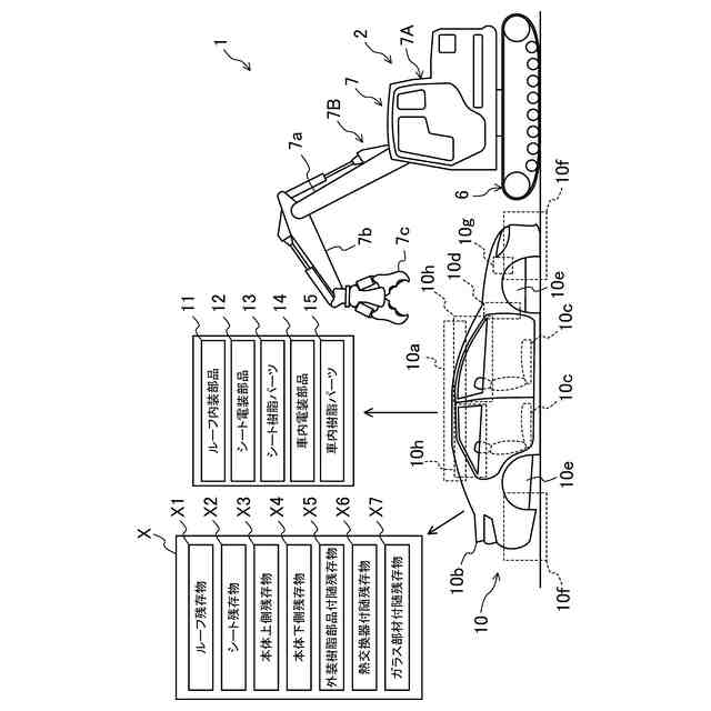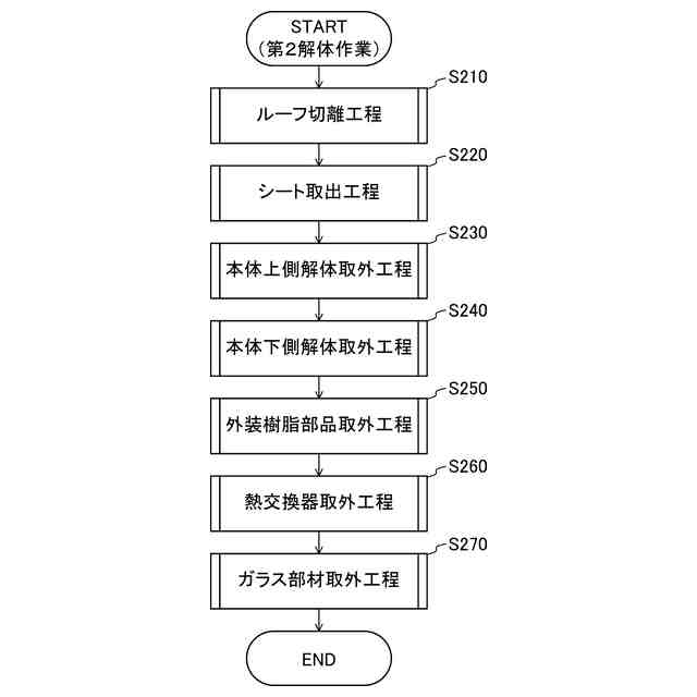 従来、使用済自動車は、解体及び破砕される過程において有用な金属や部品を回収して再利用することが行われる。近年では、使用済自動車が保有する金属や部品といった有用物を極力捨てることなく回収できるように様々な取り組みがなされている。例えば、特許文献1に開示されている自動車の解体においては、使用済自動車のウインドガラスを使用済自動車の本体部から取り除いた後、使用済自動車のルーフ部を本体部から切り離し、その後、本体部の車室内から車内樹脂パーツを取り外すとともに、ルーフ部からもルーフ樹脂パーツを取り外して解体自動車にしている。