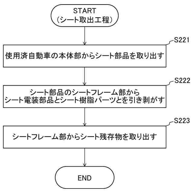 前記本体部からシート部品を取り出した後、当該シート部品のシートフレーム部からシート電装部品とシート樹脂パーツとを引き剥がし、その後、前記シートフレーム部からシート残存物を取り出す各作業を前記自動車解体機で行うシート取出工程と、