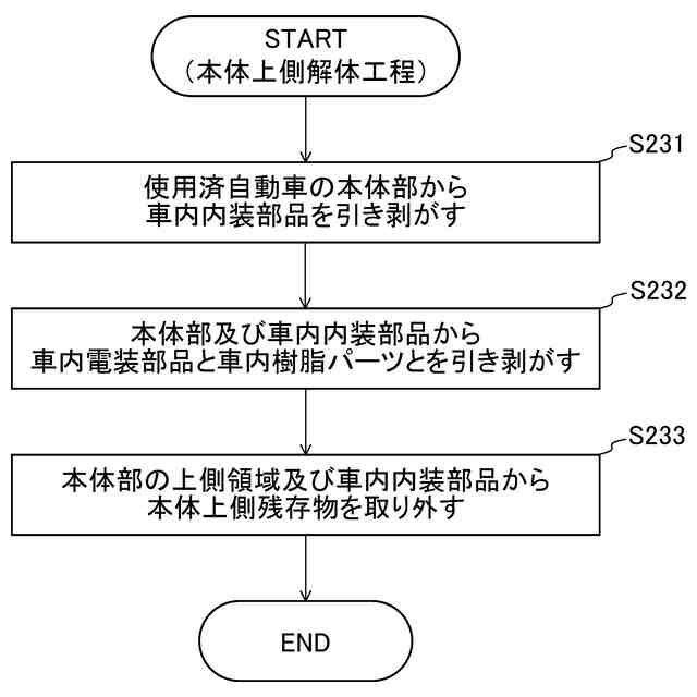 前記本体部から車内内装部品を引き剥がした後、前記本体部及び前記車内内装部品から車内電装部品と車内樹脂パーツとを引き剥がし、その後、前記本体部の上側領域及び前記車内内装部品から本体上側残存物を取り外す各作業を前記自動車解体機で行う本体上側解体工程と、