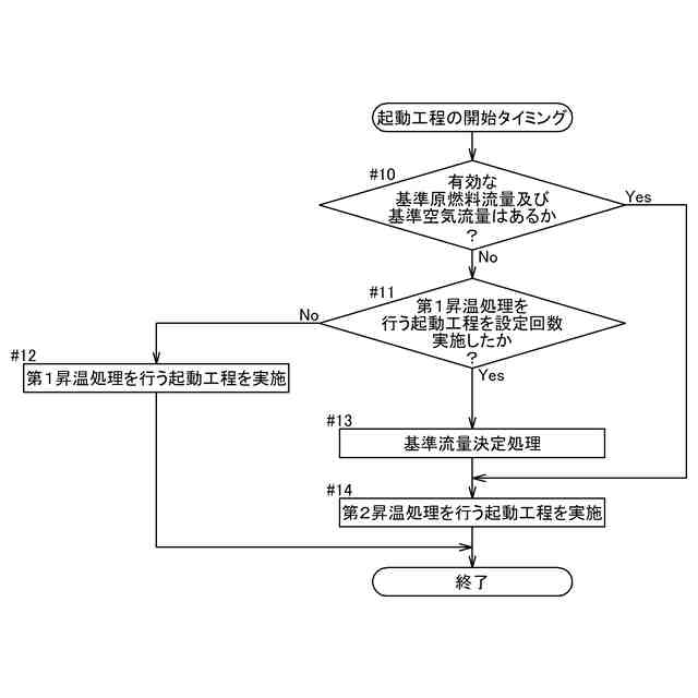 過去に行った前記原燃料流量及び前記空気流量の少なくとも一方が互いに異なる複数回の前記第1昇温処理のうち、前記第1昇温処理を開始した後、当該第1昇温処理を行っている間に前記所定部位の温度が所定の目標温度になるまでの所要時間が短かった前記第1昇温処理での前記原燃料流量及び前記空気流量のそれぞれを基準原燃料流量及び基準空気流量に決定する基準流量決定処理を行い、