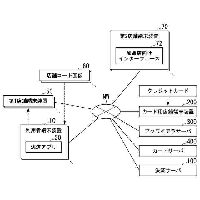 図1は、電子決済サービスが実現される電子決済システムの構成の一例を示す図である。電子決済サービスは、決済サーバ100を中心として実現される。電子決済サービスを実現する電子決済システムは、例えば、一以上の利用者端末装置10、一以上の第1店舗端末装置50、一以上の第2店舗端末装置70、決済サーバ100、カード用店舗端末装置200、アクワイアラサーバ300、およびカードサーバ400を備える。これらの装置は、例えばネットワークNWを介して通信する。ネットワークNWは、例えば、インターネット、LAN(Local Area Network)、無線基地局、プロバイダ装置、クレジットカードなどの決済システムのネットワークなどを含む。
