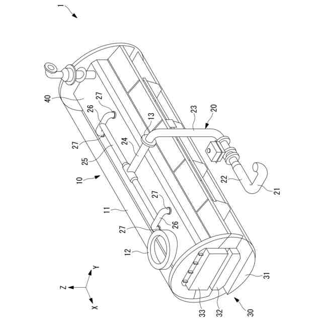 以下に、本開示に係る蒸発器の一実施形態について、図1から図7を用いて説明する。なお、以下の説明及び図面では、鉛直上下方向をZ軸方向とし、伝熱管の延在する方向をX軸方向とし、Z軸方向及びX軸方向と直交する方向をY軸方向として説明する。