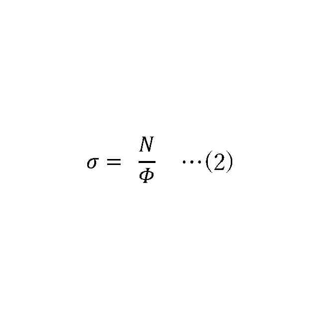 SEUクロスセクションσとは、粒子がSEUを発生させる割合である。つまり、単位面積あたり1個の粒子が半導体デバイスを通過したときのソフトエラー発生率である。SEUクロスセクションσは、半導体デバイスにフルエンスΦ(単位面積あたりに通過する粒子数)の粒子を照射したときに発生したSEUの発生数をNとすると、式(2)で表される。