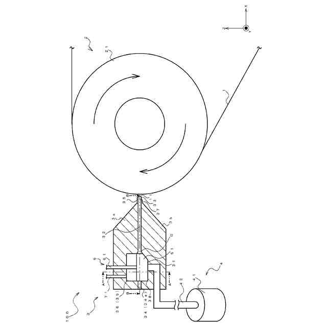 このような塗布装置には、塗布液を塗布するためのスリットダイが設けられている。スリットダイ900は、一方向に長く形成されており、図6に示すように、先細り形状である第1リップ911を有する第1分割体910と、先細り形状である第2リップ921を有する第2分割体920とを、これらの間にシム931を挟んで組み合わせて構成されている。図6および図7(a)(図6のC―C矢視断面図)に示すように、スリットダイ900は、その内部に、スリットダイ900の長手方向に長く形成され塗布液を溜めるマニホールド941と、マニホールド941と繋がるスリット942と、が形成されている。また、第1リップ911と第2リップ921との間には、スリット942の開放端である吐出口943が形成されている。すなわち、マニホールド941に溜められた塗布液951が、スリット942を通じて吐出口943から吐出される(たとえば、下記特許文献1)。