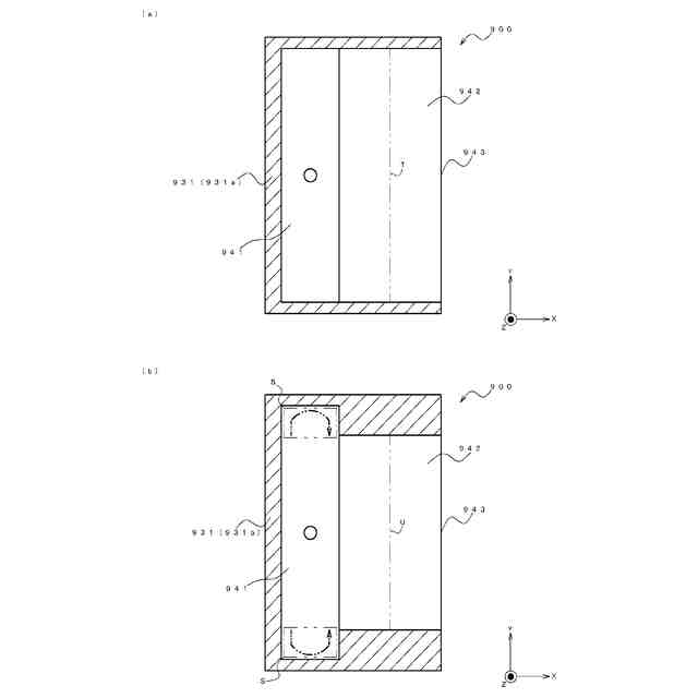 具体的には、塗布幅の変更は、第1分割体910と第2分割体920とで挟むシム931を交換することにより行われている。たとえば、図7(a)に示す内寸Tを有するシム931aにより規定される塗布幅よりも小さい塗布幅に変更する場合は、内寸Tよりも小さい内寸Uを有するシム931b(図7(b)を参照)にシム931を交換することにより、塗布幅を小さくするようになっている。このように、シム931により塗布幅を変更すると、図7(b)に示すように、マニホールド941においてスリット942よりも上記長手方向に延びた部分、すなわち、塗布液951の流れが低速になり塗布液951が滞留する滞留部Sが形成され、この滞留部Sで塗布液951に含まれる活物質などの粒子が沈降してしまうという場合があった。この状態で、塗布液951を塗布してリチウムイオン電池の製造を行うと、そのリチウムイオン電池の性能が低下してしまうという問題があった。