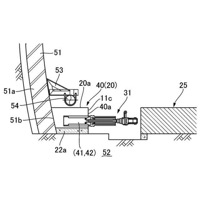 また、例えば山岳トンネルの内周面を覆う、コンクリート製のトンネル覆工体による側壁部分に、トンネルの長さ方向に延設して、配管設備構造物等の既存の設備構造物が設けられている場合には、これの下方領域に形成されている、トンネル覆工体による側壁部構造体と基礎部分との接合角部分における底部コンクリート構造体を撤去しようとすると、既存の設備構造物が障害となって、撤去し難くなる。このようなことから、既存の設備構造物の使用に影響を及ぼさないようにしつつ、これの下方領域に形成されている接合角部分の底部コンクリート構造体を、スムーズに撤去できるようにすることが望まれている。