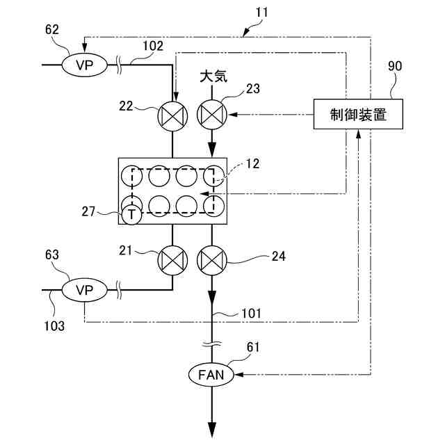 この際、空気導入・排出・密閉バルブとして、バタフライ型バルブを使う場合で、かつバルブ本体を言って方向へ付勢する付勢手段(リターンばね)を使う場合、リターンばねの突き当て位置(付勢方向)を、全開側に設定する。