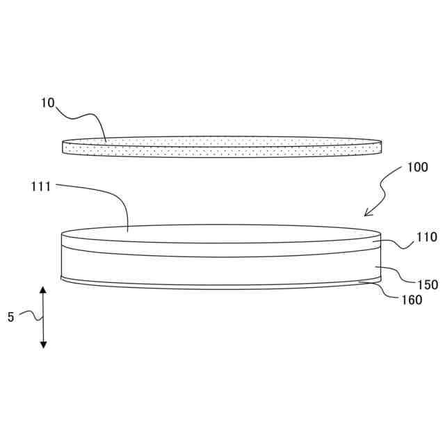 本実施形態に係る静電チャックモジュール100について、図1、2を参照しつつ説明する。本実施形態に係る静電チャックモジュール100は、シリコンウェハなどの半導体ウェハ(以下、単にウェハ10という)を吸着して保持するための基板保持部材の一例である。なお、以下の説明においては、静電チャックモジュール100が使用可能に設置された状態(図1の状態)を基準として上下方向5が定義される。図1に示されるように、本実施形態に係る静電チャックモジュール100は、セラミックス基材110と、静電吸着用電極124(図2、3参照)と、セラミックス基台150と、保護部材160とを主に備える。