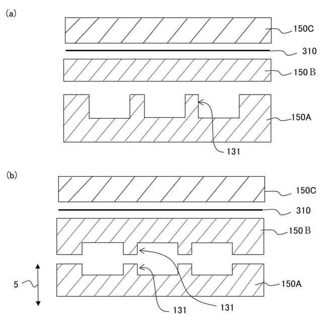 (a)は3枚の焼成体150A、150B、150Cのうち、焼成体150Aに溝131を形成した状態を示す説明図であり、(b)は3枚の焼成体150A、150B、150Cのうち、焼成体150A、150Bに溝131を形成した状態を示す説明図である。