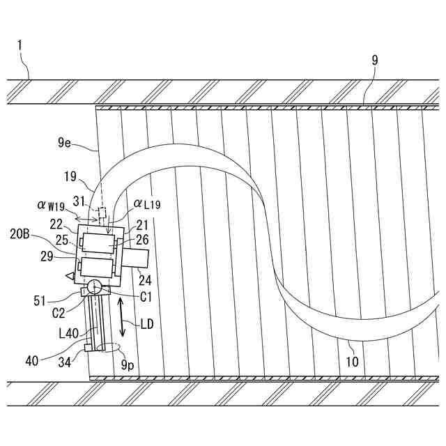 前記自走式の製管装置を用いた更生管の製管工法においては、帯状部材の後続帯部が、通常、地上のドラムから繰り出されて、発進人孔及び更生管の製管済管部分の内部を通って、製管装置の駆動ローラユニットに供給される。このとき、後続帯部は、駆動ローラユニットに対して適切な供給角度で供給される必要がある。供給角度が適切でないと、後続帯部の潰れ変形等の断面変形が起き、後続帯部と管端部との嵌合不良、脱線などの製管不良を招くおそれがある。このような不具合は、製管径が小さいほど発生しやすい。また、後続帯部に巻き癖を付与する巻き癖付与装置を省略した場合に発生しやすい。更に、更生管の内周に沿う環状の内周規制体を有しない内周規制体レス構造(内周開放構造)の製管装置の場合、後続帯部の経路上にガイドを設けることが困難であるために、前記不具合が発生しやすい。