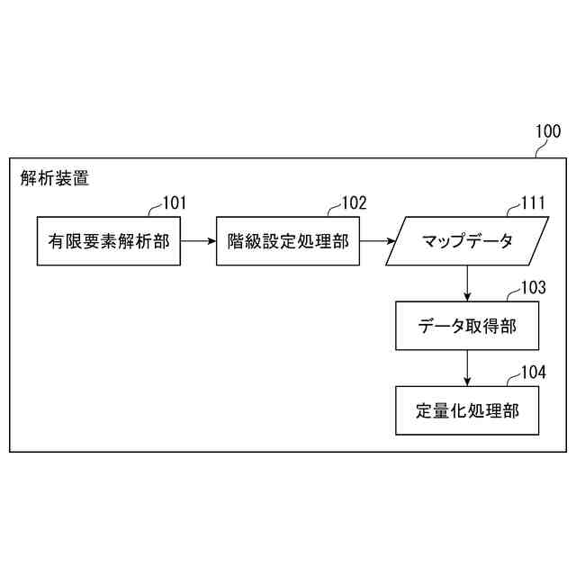 図1は、本発明の一実施形態に係る解析システムの概略的なブロック図である。図示されるように、解析システム100は、有限要素解析を実行する有限要素解析部101と、解析値に対して階級を設定する階級設定処理部102と、階級値がマップされたマップデータ111を取得するデータ取得部103と、マップデータ111における階級値の分布を定量化する定量化処理部104とを備える。