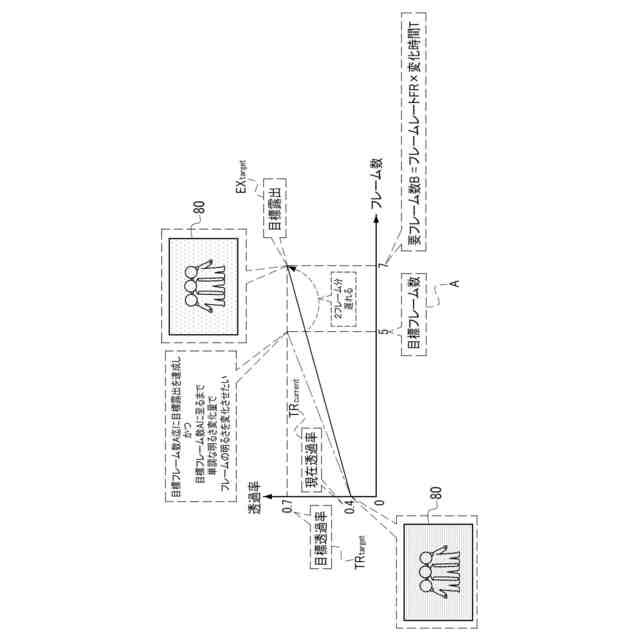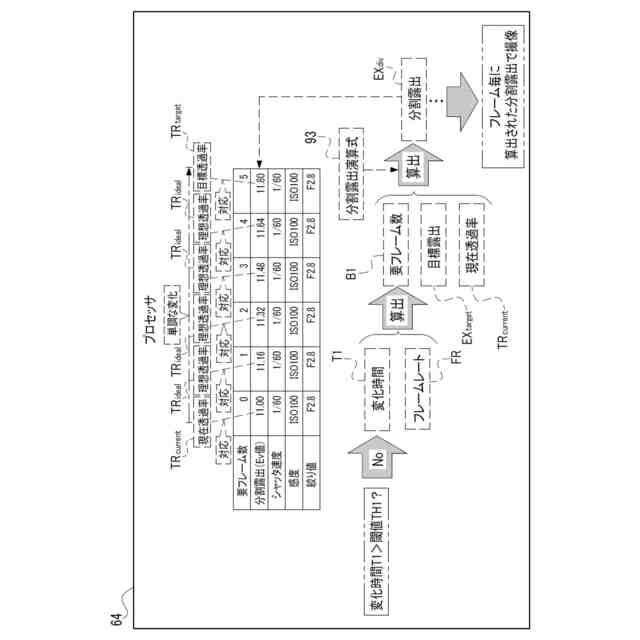 本開示に係る第2の態様は、複数のフレームが、既定フレームレートに基づいて撮像が行われることで得られ、変化時間と既定フレームレートとに基づいて複数のフレームの枚数が定められ、複数の分割露出が、目標露出と枚数とに基づいて定められる、第1の態様に係る制御装置である。