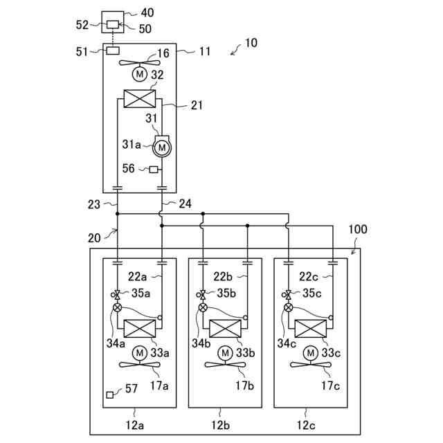 第2の態様の制御器(50)は、第1動作において、冷媒センサ(57)が冷媒を検知すると、漏洩報知処理を行うと共に、圧縮機(31)を停止させる。