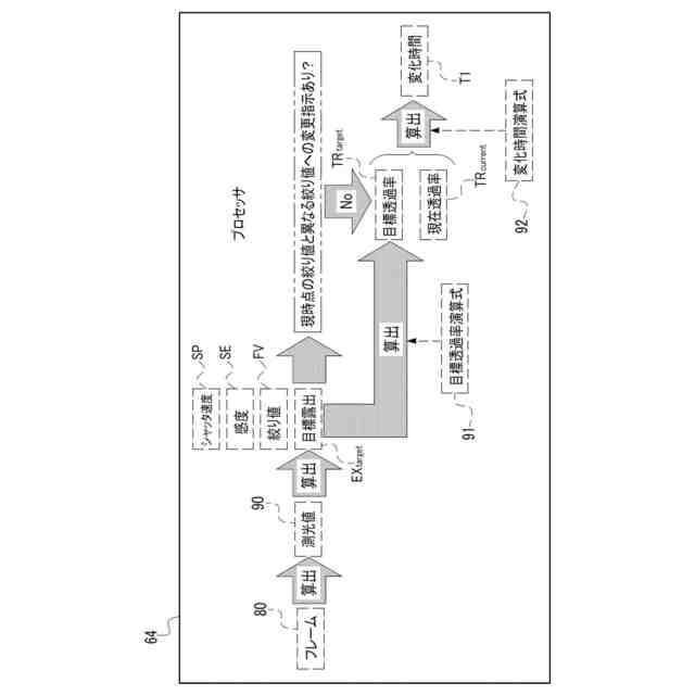 本開示に係る第3の態様は、変化時間と駆動時間とが第1閾値を超えた場合に第1制御が行われ、第1制御が、変化時間を駆動時間内にする制御であり、かつ、第1透過率から第2透過率へ現実的に変化する時間である現実変化時間と駆動時間とに基づいて定められた複数の第1分割露出を複数の分割露出として複数のフレームの露出に適用する制御である、第2の態様に係る制御装置である。
