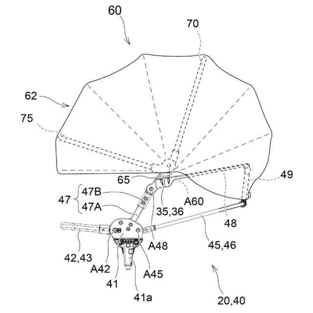特許文献1に記載されているように、これらの育児器具に、日除け等を目的として幌が設けられ得る。従来の幌は、通常、幌ベース部材と、幌ベース部材に対して相対揺動可能な複数の幌骨と、幌骨に保持された幌布と、を有する。幌骨を揺動させることによって、幌を開く(広げる)こと及び幌を閉じる(畳む)ことができる。
