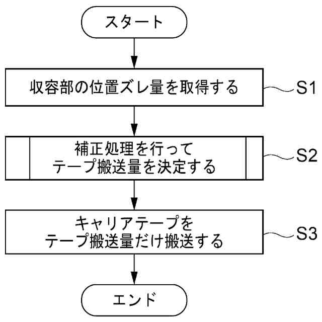 補正処理を行って、前記キャリアテープの搬送基準量に対する搬送補正量を決めて、前記搬送基準量及び前記搬送補正量に基づいてテープ搬送量を決定する制御装置と、