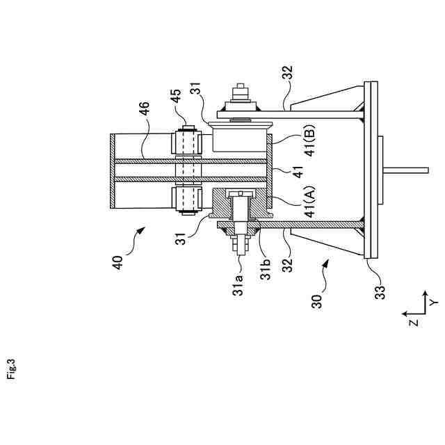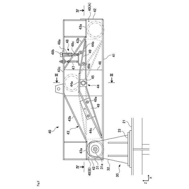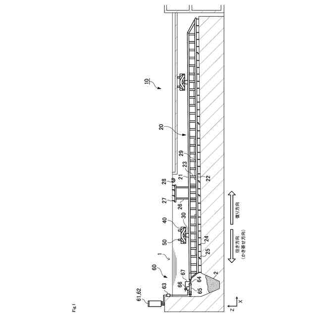 ところで、特許文献1で提案された汚泥かき寄せ装置(10)は、例えば図12と図14に示されるように、垂下部材(40)が、ローラ支持部材(43)の両端にローラ(45)を回転自在に装着されており、ガイド装置(50)には、これらの2つのローラ(45)をそれぞれ案内するための一対のシーソー板(第一のフラップ部材59、第二のフラップ部材65)とガイドレール(50A,50B)が形成されている。つまり、ガイドレール(50A,50B)にある一対のシーソー板の間に挟み込まれるようにして垂下部材(40)のローラ支持部材(43)が配置され、このローラ支持部材(43)に装着された2つのローラ(45)がそれぞれシーソー板上を移動することとなる。