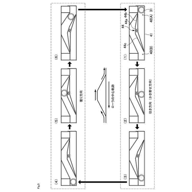 本発明の発明者は、上記の従来発明の課題を解決する手段について鋭意検討した結果、ガイド装置内で複数のローラを移動させるガイド機構において、ガイド装置の幅方向(Y軸方向)の左右外側に各ローラを支持するためのローラ支持部材を配置し、一対のローラ支持部材の間にガイド装置を挟み込むようにすることで、ガイド機構の作動点数と部品点数が減少し、動作の信頼性と耐久性を向上させることができるという知見を得た。そして、本発明者は、上記知見に基づけば従来発明の課題を解決できることに想到し本発明を完成させた。具体的に説明すると、本発明は以下の構成を有する。