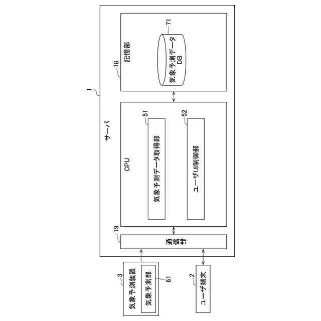 図1に示す情報処理システムは、サーバ1と、ユーザ端末2と、気象予測装置3とが、インターネット等の所定のネットワークを介して相互に接続されることで構成される。