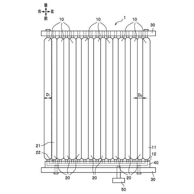 とは、異なっており、第一タンク10及び第二タンク20は、千鳥状に配置されており、第一方向から見て、第一タンク10及び第二タンク20は、互いに重なっている。