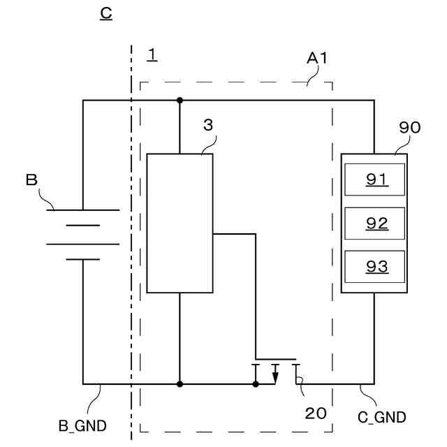 図1は、車両用表示装置1(図面内二点鎖線から右側)のサージ保護回路A1(粗破線内)の回路構成を示す図であり、車両Cのバッテリや発電機からなる電源Bからの電力を、車両用表示装置1内の負荷回路90へ供給するまでの構成について示している。負荷回路90は、車両情報を示す表示部93や、表示部93を制御する制御部92、レギュレーター91を備える。負荷回路90は、電源Bから供給される電力や、情報通信に伴って入力される電気信号に基づいて、所定の動作を行う。