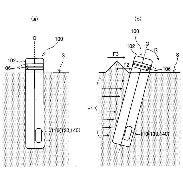 (a)は、海面に浮いている浮体部の長手方向が略鉛直方向を向いた縦軸型波力発電装置の姿勢を示す説明図。(b)は、海面に浮いている浮体部の長手方向が略鉛直方向から傾斜した縦軸型波力発電装置の姿勢を示す説明図。