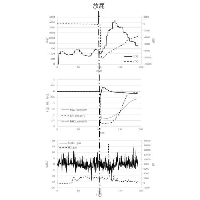 図7に示すセンサ部による放屁の検出結果を示すグラフ。