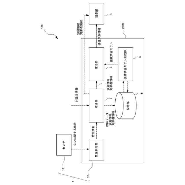[2]対象者の放屁を検知するセンサ部と、前記対象者に関する対象者情報を取得する取得部と、前記センサ部により検知された放屁に関する放屁情報と前記取得部により取得された前記対象者情報とを記憶する記憶部と、前記記憶部に記憶された前記放屁情報と前記対象者情報とに基づいて前記対象者の次回の排便に関する排便予測情報を推定する推定部とを備えた、排便予測補助システム。